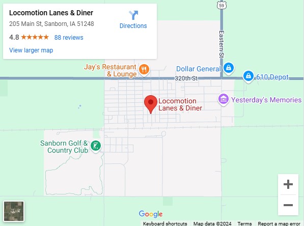 Looking for the perfect activity out in Northwest Iowa? Locomotion Lanes in Sanborn is your go-to spot for a top-notch bowling alley experience, friendly neighborhood service, and delicious diner classics. Whether it’s a family night out, a birthday party, a fun date, or a casual meal, we’ve got you covered with 8 state-of-the-art lanes and a menu packed with pizza, burgers, and fries.